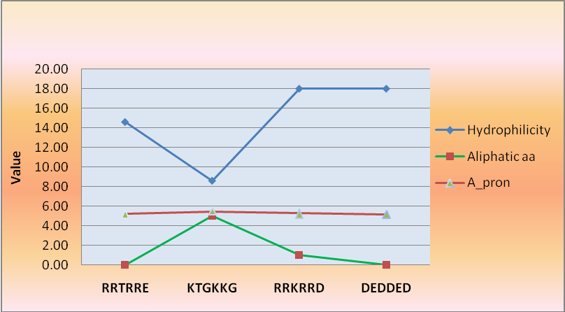 Fig. 1: Antigenic propensity, hydrophilicity and aliphatic amino acids in hexapeptide epitopes of Ebola virus