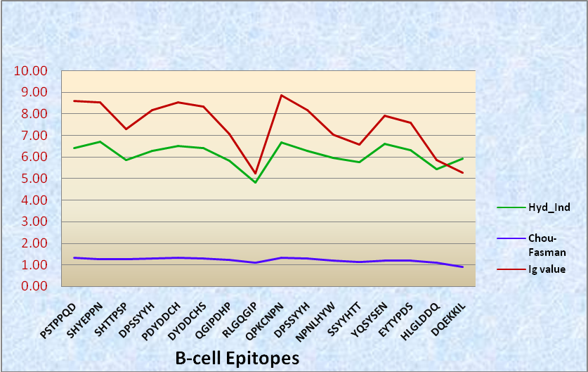 Fig. 4: Hydropathy index, Chou-Fasman conformation and immunogenicity (Ig) of B cell epitopes in Ebola