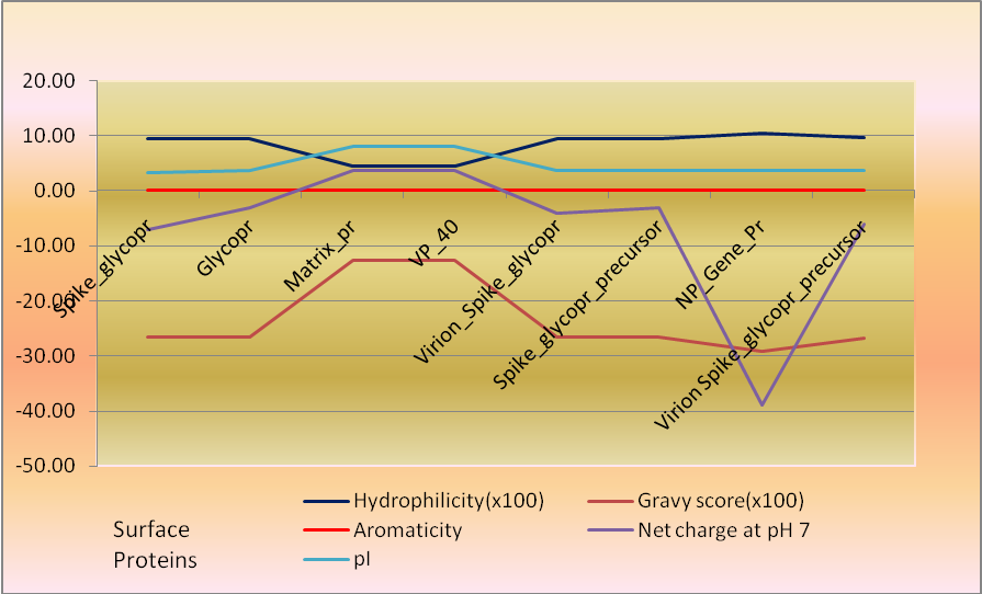 The surface proteins having potential to generate the efficient epitopes for use as vaccines were further analyzed following in silico approach for the polar/non-polar amino acids, hydrophilicity, Gravy score, aromaticity, net charge at neutral pH (7.0) and pI (isoelectric point) to elucidate the interrelationships among the surface proteins for each biochemical character.