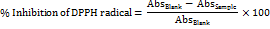 AbsBlank and AbsSample are the absorbances of the blank and sample reactions. IC50 (Concentration scavenging 50 % of DPPH radicals) was graphically determined. Gallic acid and Quercetin were used as positive controls.