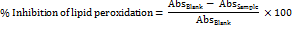 AbsBlank and AbsSample are the absorbances of the blank and sample reactions. IC50 (Concentration inhibiting 50 % of lipid peroxidation) was graphically determined. Quercetin was used as a positive control.