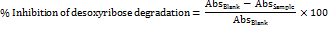 The ability of HAE of Wissadula amplissima to prevent the degradation of the desoxyribose was determined using the method described by Houghton et al. [17]. Briefly, freshly prepared 2-desoxyribose (100 µl, 28 mmol in phosphate buffer 50 mmol, pH 7.4), EDTA (500 µl; 1.04 mmol), FeCl3 (100 µl; 100 mmol), H2O2 (100 µl, 1.0 mmol) and ascorbic acid (100 µl, 1.0 mmol) was mixed and incubated at 37 °C for 1 hour with HAE (100, µl; 1 mg/ml). Thiobarbituric acid (1 ml of 1% aqueous solution) and trichloroacetic acid (1 ml of 2.8 % aqueous solution) was added to the mixture and incubated at 100 °C for 20 min. The resultant mixture was centrifuged (3000 g for 10 min). Absorbance of the organic layer containing thiobarbituric acid reactive substances was measured at 532 nm against a blank (methanol) with a microplate reader (Epoch, BioTeck instruments, USA). Inhibition of Desoxyribose degradation was calculated as following: