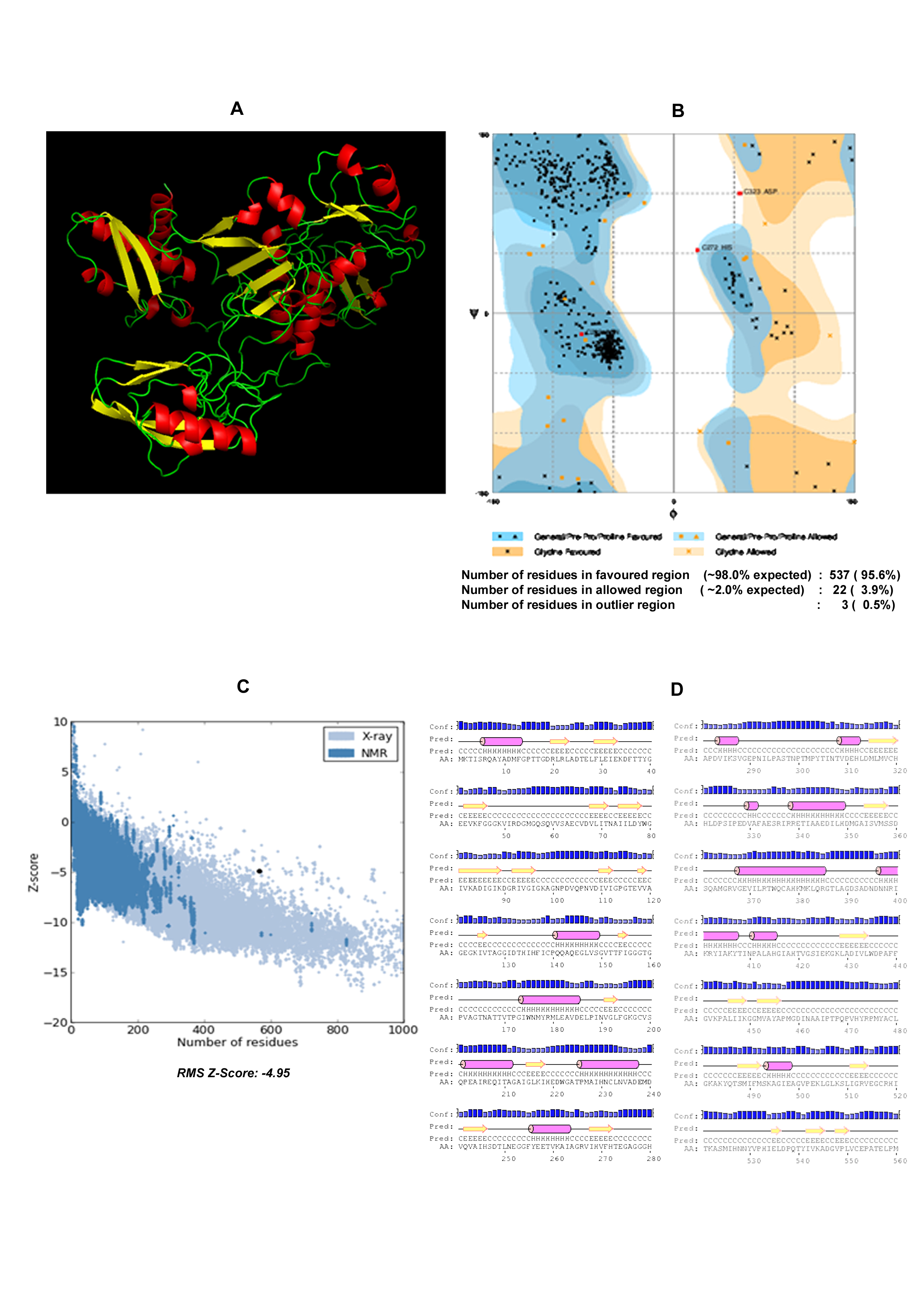 Fig. 3: A) Homology modeled structure of ureC with alpha helix shown in yellow, beta sheet in red and coils in green color. B) stereochemical nature of the protein ureC. C) Quality of protein ureC as predicted by RMSZ score. D) Secondary structure of ureC.