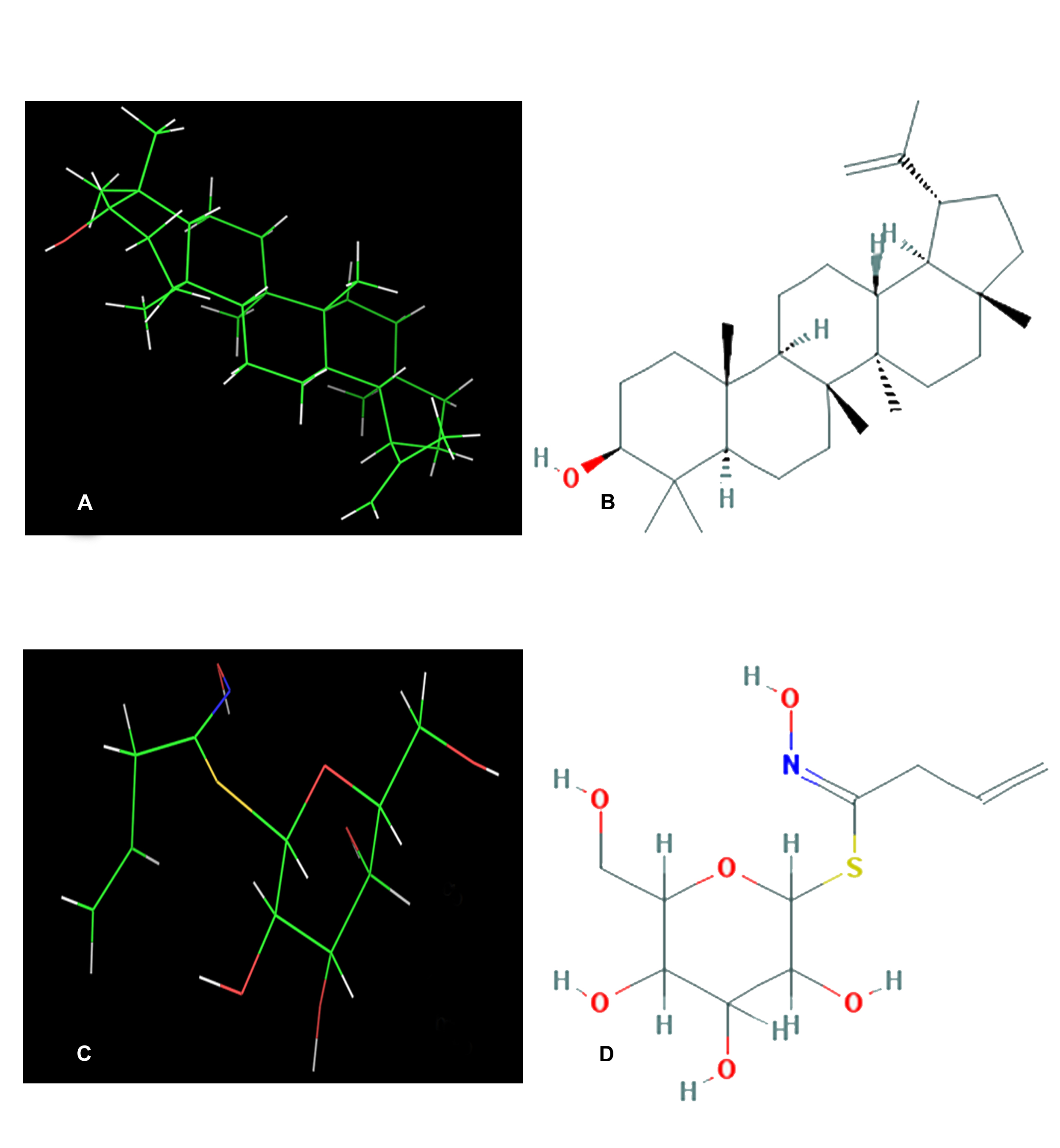 Fig. 4: A) and B) Three dimensional and one dimensional views of Desulphosinigrin respectively. C) and D) Three dimensional and one dimensional views of lupeol respectively.