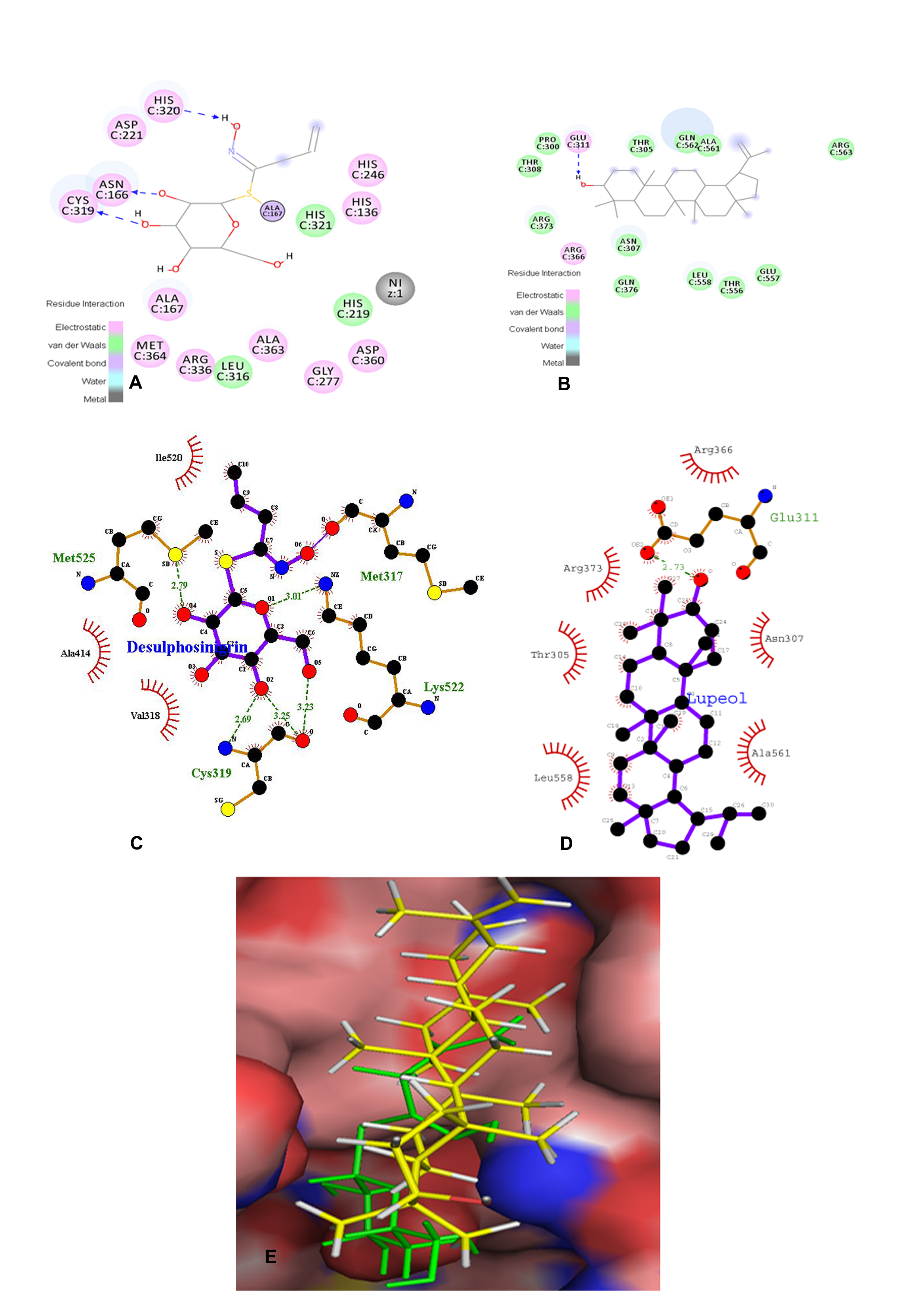 Fig. 5: A) Hydrogen bond interactions between desulphosinigrin and ureC. B) Hydrogen bond interactions between lupeol and ureC. C) Hydrogen bond interactions between of desulphosinigrin and ureC based on Ligplot. D) Hydrogen bond interactions between of lupeol and ureC based on Ligplot. E) Three dimensional views of interactions among ureC, desulphosinigrin (Green) and lupeol (Yellow).