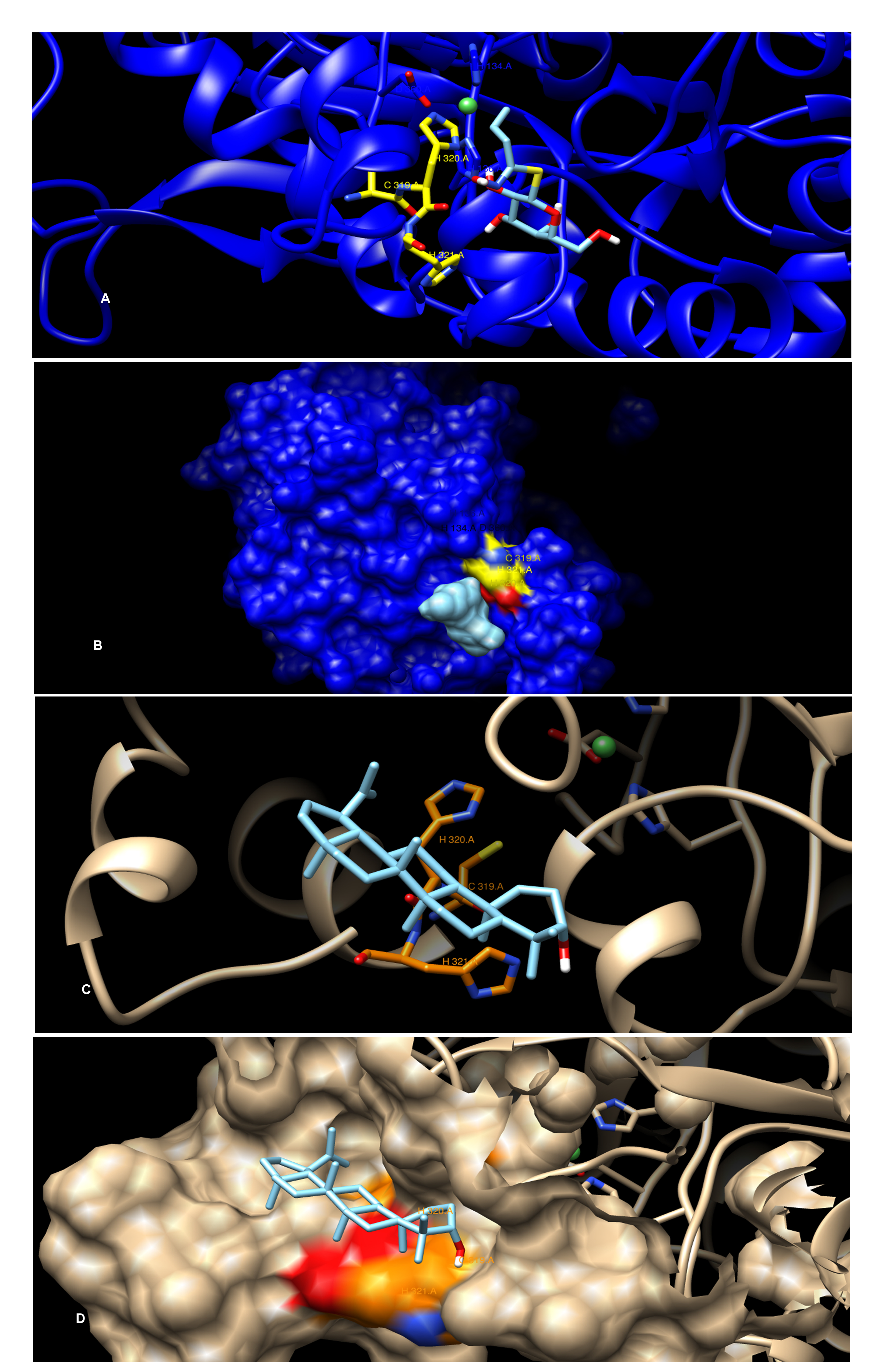 Fig. 6: A) and B) Flexible docking results for desulphosinigrin. C) and D) Flexible docking results for lupeol