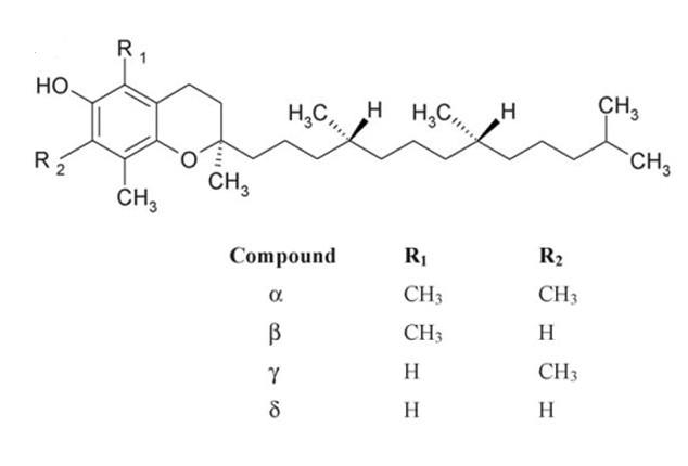 α-Tocopherol (vit. E), 2, 5, 7, 8-tetramethyl-2-[(2R, 8R) 4, 8, 12-trimethyl tridecyl] 3, 4-dihydro-2H-chromene-6ol, encompasses eight molecules composed by a chromanol ring and a phytol side chain displaying identical functions: four tocopherols (α, β, γ and δ) and four tocotrienols (α, β, γ, and δ). Tocopherols have saturated side chain. The prefixes α, β, γ, and δ indicate the position of methyl groups on chromanol ring [9]. Theα-tocopherol is most abundant in nature (fig. 2) [10]. One α-tocopherol molecule can trap two peroxyl radicals responsible of lipid oxidation initiation [11]. Hence, this molecule protects membrane lipids against oxidation [12].