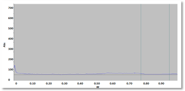 The specificity of the method for assay was demonstrated by applying 10 µl band of STD, blank and sample solutions on the HPTLC plates for rectification of specificity of method.