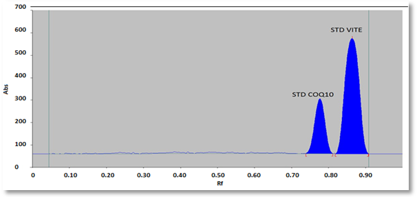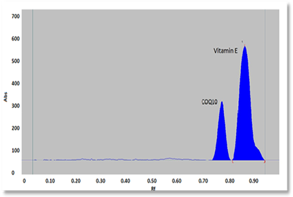 Results: The Rf values were 0.77 and 0.87 for co-enzyme Q10 and α-tocopherol, respectively. The linearity of the method was found to be in the concentration range of 0.6µg-1.8 µg/band for α-tocopherol and 2 µg-6 µg/band for co-enzyme Q10. The limits of detection and quantification were 0.3154 and 0.9559 µg/band for α-tocopherol and 3.441 and 10.42 µg/band for co-enzyme Q10.