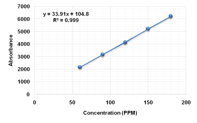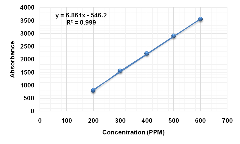 The linearity of peak area response for α-tocopherol and co-enzyme Q10 was determined from 50 % to 150 % level of working concentration for both the STD. The mixed stock solutions of α-tocopherol and co-enzyme Q10 were diluted in five different known concentrations. Graphs of concentration (as x-value) versus area (as y-value) were plotted.