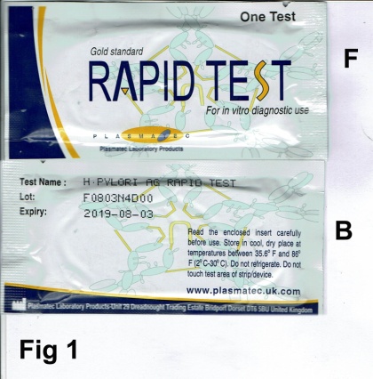 In the laboratory, the detection of H. pylori antigen in stool samples was done by using the One-Step H. pylori Antigen Test Card (RAPID TEST/www. plasmatec. uk. com) fig. 1. The test was carried out according to [13]. The subsequent steps were followed: