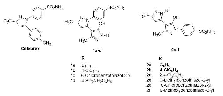 In view of above facts and observations, we have therefore, synthesized two series of compounds, namely, 1-[(4-aminosufonyl)phenyl]-3-methyl-5-[1-aryl/heterocyclyl-5-hydroxy-3-methylpyrazol-4-yl]pyrazoles (1a-d) and 1-aryl/heterocyclyl-3-methyl-5-[1-(4-aminosulfonyl)phenyl-5-hydroxy-3-methylpyrazol-4-yl]pyrazoles (2a-f), in which the 5-aryl substituent of the lead class 1,5-diarylpyrazoles have been replaced by a heterocyclyl pyrazole moiety.