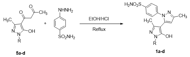 Various arylhydrazines [15] and 2-hydrazinobenzothiazoles [16] needed for the present study, were prepared according to the literature procedures. The bipyrazoles (1a-d) were prepared by the reaction between 1-[1-aryl / (benzothiazol-2yl)-5-hydroxy-3-methylpyrazol-4-yl]-butane-1,3-diones (5a-d) and (4-aminosulfonyl)phenyl hydrazine as shown in scheme-3.