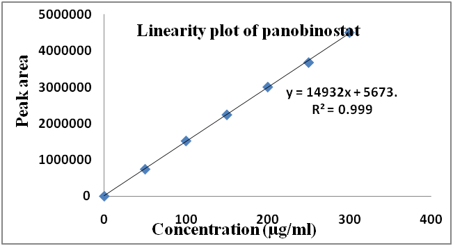 Results: The retention time for panobinostat was found to be 1.6 min. The developed method was validated for accuracy, precision, specificity, ruggedness, robustness and solution stability. The method obeyed Beer’s law in the concentration range of 50µg/ml and 300µg/ml with correlation coefficient of 0.9998. Forced degradation studies were conducted by exposing the drug solution to various stress conditions such as acidic, basic, peroxide, neutral, photolytic and thermal conditions. The net degradation was found to be within the limits, indicating that drug is stable in stressed conditions.