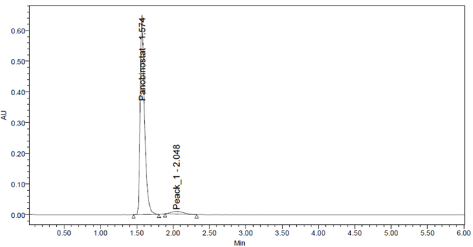 200 mg of panobinostat working standard was dissolved in 100 ml of diluent. 1 ml of the above stock solution was diluted to 10 ml using diluent in order to get a concentration of 200µg/ml.