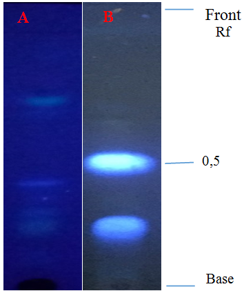 In addition, some flavonoids appear in blue under UV/366 nm without any revelation, and the color of these spots intensified after spraying the reagent of Neu; they have been identified as methylated flavonoids: Rf = 0.26 [8]. Coumarins are detected by the lead (II) acetate in fluorescent blue, violet, yellow with Rf = 0.1; 0.26; 0.31; 0.4. The reagent of Liebermann Bürchard made it possible to highlight on the one hand sterols with Rf = 0.13; 0.15; 0.2; 0.69; 0.8 in brown and green in the visible and in yellow and yellow-green under UV at 366 nm [18-19]. On the other hand, the terpenes are detected at Rf = 0.1; 0.69; 0.8 in blue and violet in the visible and yellow-orange under UV/366 nm [17]. Finally, the tannins and alkaloids were identified respectively with iron trichloride in gray or black with Rf =; 0.0; 0.32; 0.51; 0.55 and with Dragendorff’s reagent in a yellow spot at Rf = 0.0 [8].