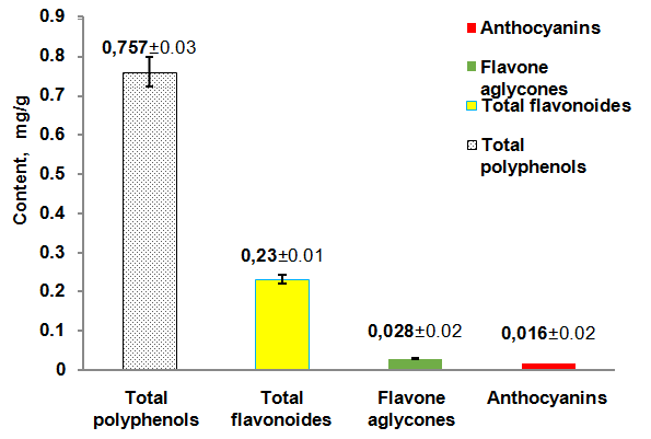 Fig. 2 describes the amount of different phenolic compounds embedded in Lannea barteri Engl. The results highlight that the overall polyphenols content is 0.757±0.03 mg AG/g DM and the number of total flavonoids is found to be 0.230±0.01 mg/g DM representing 30.38 %. Furthermore, flavone aglycones and anthocyanins were found with respective amounts of 0.028±0.02 mg/g DM and 0.016±0.02 mg/g DM. The obtained results are clear indications of the richness of the studied extracts in different classes of flavonoids.