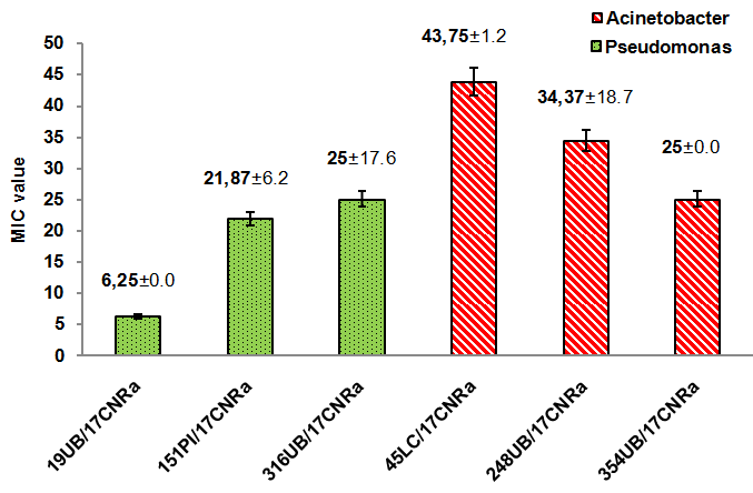 | Pseudomonas aeruginosa | 19UB/17CNRa | 6.25±0.0 | 6.25±0.0 | 1 | absolute bactericidal |
