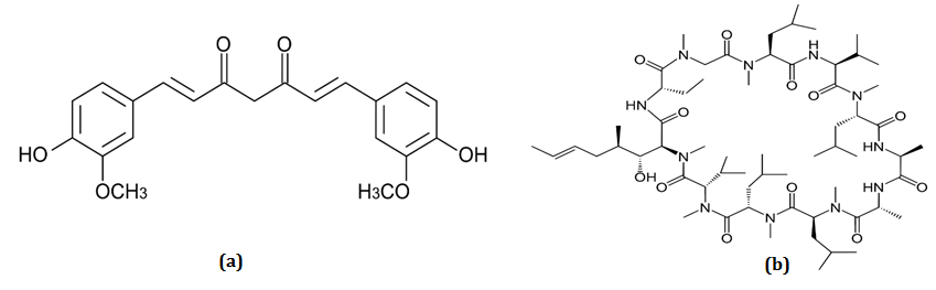 Fig. 1: Molecular structure of (a) curcumin and (b) cyclosporine