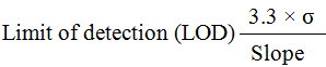 Limit of detection (LOD) and limit of quantification (LOQ) decide the sensitivity of the method. LOD is the lowest detectable concentration of the analyte by the method while LOQ is the minimum quantifiable concentration. ICH defines the detection limit of an individual analytical procedure as the lowest amount of analyte in a sample which can be detected but not necessarily quantitated as an exact value. The LOD is the point at which a measured value is larger than the uncertainty associated with it. The quantitation limit is a parameter of quantitative assays for low levels of compounds in sample matrices and is used particularly for the determination of impurities or degradation products. LOD and LOQ were calculated from standard calibration curves of drugs using following equations-