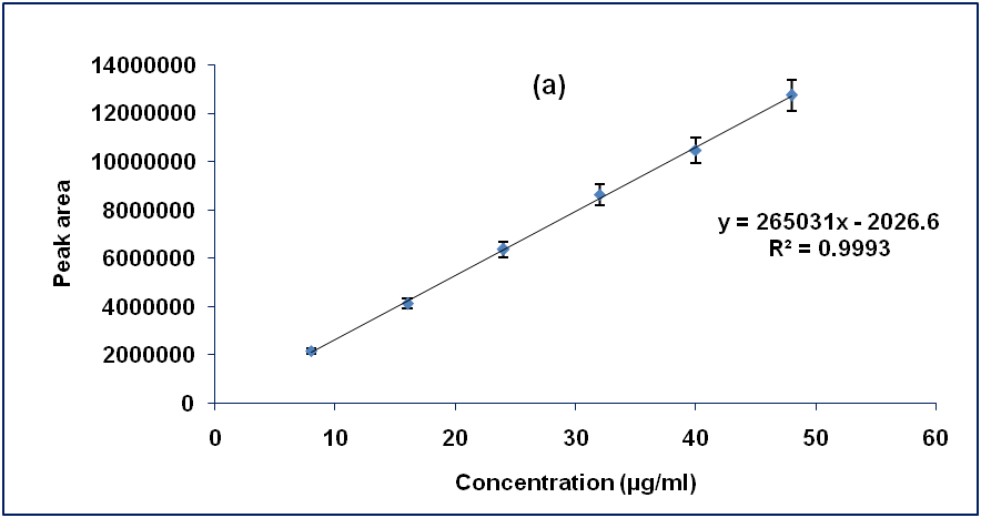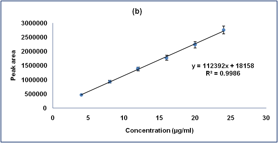 Fig. 5: Linearity curve of (a) curcumin and (b) cyclosporine, (*n: 3 i.e. number of injections of each concentration. The data is expressed in graph as mean±SD, *SD: standard deviation)