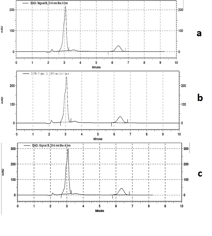 Fig. 4: Chromatogram of curcumin and cyclosporine in accuracy studies at (a) Level 1: 80%, (b) Level 2: 100% and (c) Level 3: 120%
