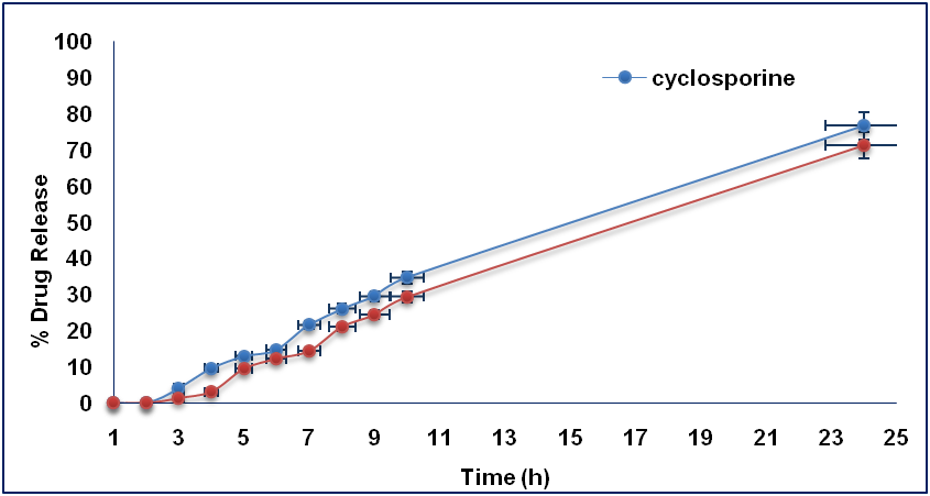 Drug content of the formulation was found to be 97.34±0.5% for curcumin and 95.68±0.63% for cyclosporine. Hence it complies with the Pharmacopoeial limit of assay of drugs (90%-110%).