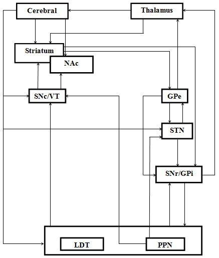 The cholinergic neurons of the LDTg mainly innervate the Ventral tegmental (VTA) neurons, influence their burst firing and the consequent release of dopamine in the nucleus accumbens and thereby influence goal-directed behaviors. In contrast, the PPTg neurons innervate both Substantia nigra pars compacta (SNc) and VTA neurons. The PPTg neuronal activity alters dopamine release in the dorsal as well as ventral striatum and thereby modifying whole basal ganglia activity through its effects on striatal outputs and ultimately behavior.