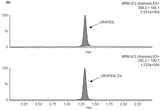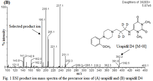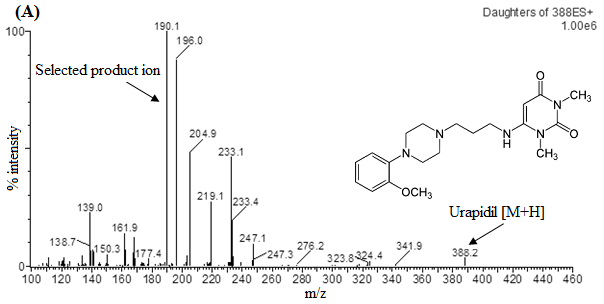 Utilization of predominant product ions for each compound enhanced mass spectrometric specificity. The mass transition ion-pair was selected as, 388.2 → 190.1 for urapidil and 392.2 → 190.1 for urapidil D4. The product ions selected were specific for urapidil and urapidil D4, respectively.