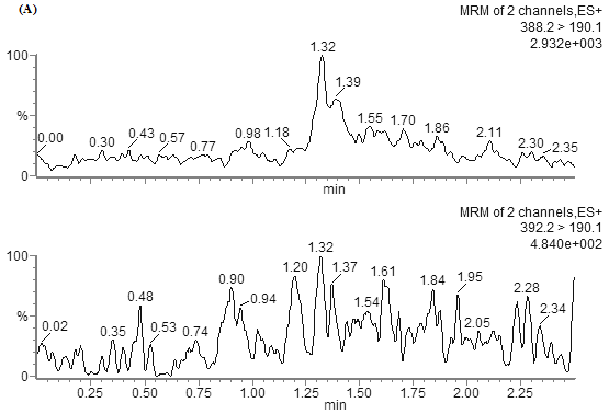 Chromatographic separation was carried out on Waters UPLC with Betasil-C18 (50mm x 4.6mm, 5µm) purchased from Thermo scientific, United States. A degassed mobile phase consisting of acetonitrile: methanol (70:30, v/v) (A) and 10mM ammonium formate pH about 4.50±0.05 (B) was delivered with a flow rate of 0.5 mL/min using solvent composition gradient. Each analytical run was started at 40% A up to 0.2 min followed by a liner gradient to 60% A over 0.6 min, held at 60% A for 1.2 min, shifted to linear to 40% A over 0.2 min and then held constant until the end of the run for column equilibration to take on the next analytical run. The total run time for each sample analysis was 2.5 min. The gradient elution program of chromatographic separation is presented in Table 1a. The column oven temperature was kept 40 ºC. Mass spectra were obtained using a Xevo TQ-S mass spectrometer, a triple-stage quadrapole-mass-analyzer with photomultiplier detector equipped with electro spray ionization (ESI) source (Waters Ltd. UK) running on positive ion mode. The mass spectrometer was operated in the multiple reaction-monitoring (MRM) scan mode. The data acquisition was ascertained by MassLynx 4.1 software. The details for ion source and analyte dependent MS parameters are presented in Table 1b.