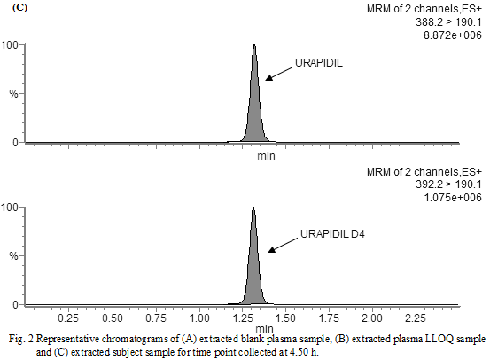 Conclusion: The developed and validated method was specific, sensitive and reproducible in the analysis of clinical samples interspersed with quality control samples under freshly prepared calibration standards. The method was applied for the determination of the pharmacokinetic parameters of urapidil following a single oral administration of urapidil 60 mg capsules in nineteen healthy Indian male volunteers for fasting and fed study.