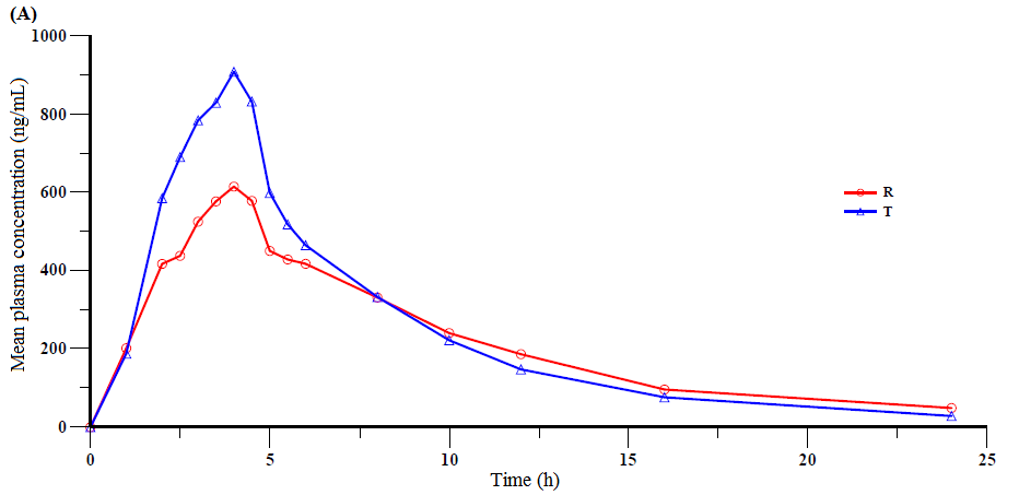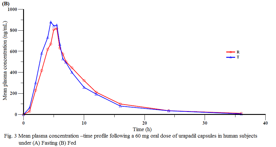 Fig. 3: Mean plasma concentration –time profile following a 60 mg oral dose of urapidil capsules in human subjects under (A) fasting and (B) Fed.