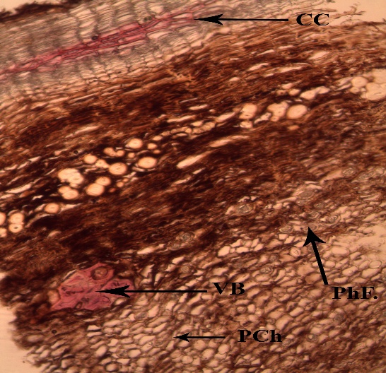 The different cell structures found in the transverse section microscopy and powder microscopy of the bark of Cascabela thevetia L. are shown in fig. 1 and fig. 2.