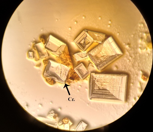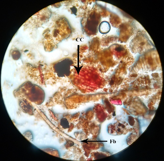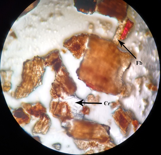 Fig. 2: Powder microscopy of the bark of Cascabela thevetia L., (a) Cr-Calcium oxalate crystal, (b) CC-Cork cell, (c) CC-Cork cell, Fb-Fibre, (d) Cr-Crystal, Fb-Fibre