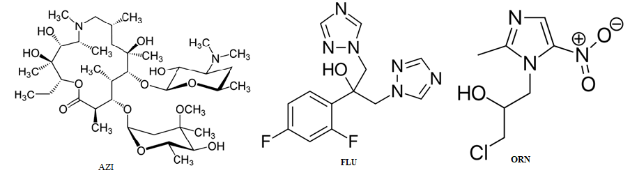 Fig. 1: Chemical structures of azithromycin, fluconazole and ornidazole