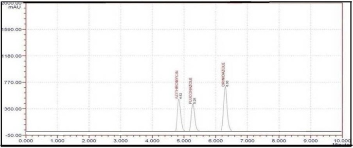The study of the absorption spectrum for three drugs revealed that well-defined ʎmax. The iso-absorptive point was obtained at 210 nm for three drugs at the given concentration. Obtained wavelength maxima and iso-absorptive point for the three drugs were used for the simultaneous estimation by using RP-HPLC method. The overlain spectrum of azithromycin, fluconazole and ornidazole was shown in fig. 2.