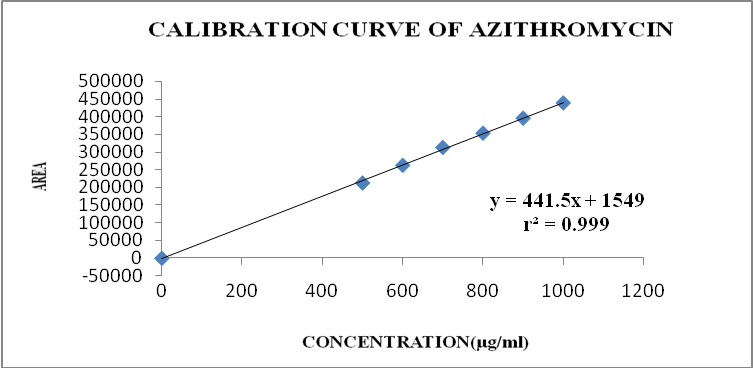 | Azithromycin | 500 | 212776 | y = 439.5x+1549 r² = 0.999 |