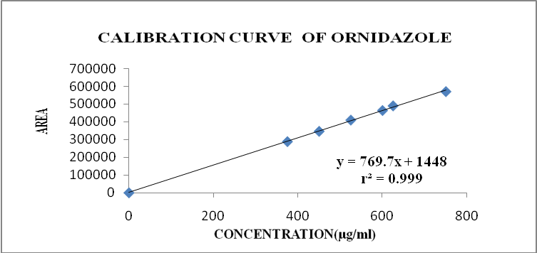 | Ornidazole | 375 | 288696 | y= 772.2x+1448 r² = 0.999 |