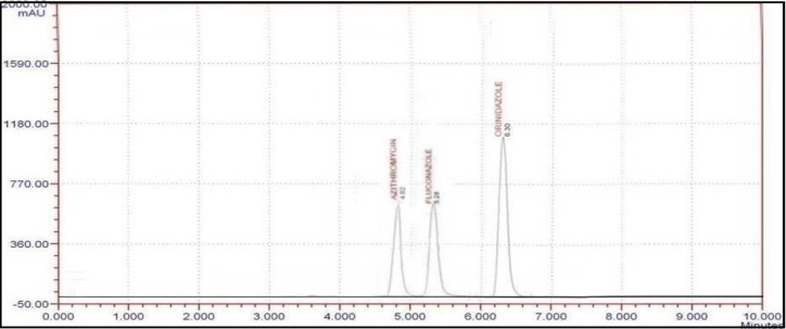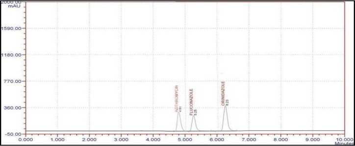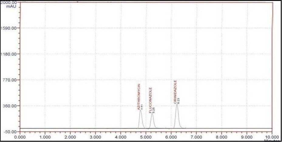 Fig. 3: Standard chromatogram of azithromycin, fluconazole and ornidazole in acetonitrile and phosphate buffer pH-4.8 (50:50%v/v)