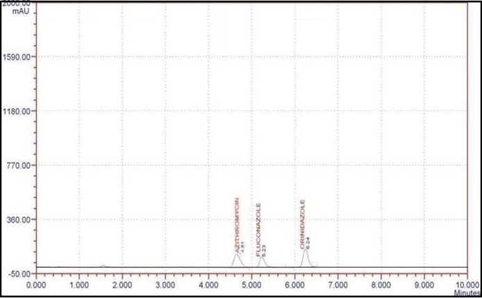 Transfer 100 mg of azithromycin, 15 mg of fluconazole and 75 mg of ornidazole into a 100 ml of volumetric flask and add 70 ml of diluent. Then it was sonicated for 15 min and the volume made up to 100 ml with diluent. The resulted solution (20 µl) was injected into the HPLC system by employing optimized chromatographic conditions.