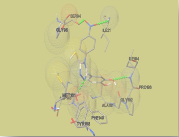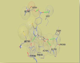 Molecular modeling technique was used to explore, predict and understand the protein/enzyme interactions with designed 1, 2, 4-triazole library; and also to visualize the probable binding. Analogues were docked with various receptors using Autodock 4.2.1 and the binding energy obtained are shown in table 2. Docking studies of targeted compounds with CYP51 protein showed good binding interactions and formed various hydrophobic interactions with active site residues. The ligand 4a3 exhibited a docking score of 9.73, with the main hydrophobic interactions with the surrounding residues ALA191A, GLY192A, ILE194A and PRO193A, strongly contributed to the stabilization with 1EA1. The hydrogen bonding interaction of hydroxyl group protons of 4a3 were with the residues SER94A and LYS166A.