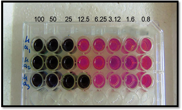 Microplate Alamar Blue Assay (MABA) method was used for the study. Prior to the bioassay, a standard stock solution with the concentration of 32 μg/ml was prepared and stored to be used for the positive control. Control wells without tested derivatives and sterility controls were assayed simultaneously. Pyrazinamide was prepared from the stock solution just prior to inoculation time to the concentration of 5 μg/ml in the total volume of 200 μl. The growth inhibition result was explained by MABA using 1 % resazurin. The reagent allows the detection of microbial growth in microtiter plates without the use of a spectrophotometer. The susceptibility test conducted by the MABA was using 96 well microtitre plates to evaluate the susceptibility of H37Rv MTB reference strain to the derivative. The inhibitory concentration of all derivative was evaluated with concentrations of 250 mg/ml, 500 mg/ml and 1000 mg/ml in the total volume of 200 μl. The measured derivatives were mixed with the bacterial suspension and the diluent media (7H9) in the well. The alamar blue oxidation-reduction dye is a general indicator of cellular growth and/or viability; the blue, non-fluorescent, oxidized form becomes pink and fluorescent upon reduction. Growth was therefore determined by a visual color change. The derivatives were considered active (have inhibitory activity) for the well of the plate with unchanged color or the blue, non-fluorescent, oxidized form and if the color of the agent or resazurin is changed to pink (fluorescent) the derivative is inactive or the microorganism is considered resistant strain to the derivative [27].