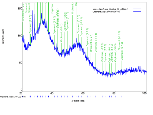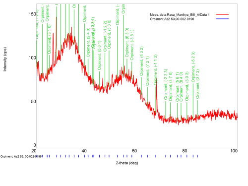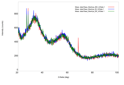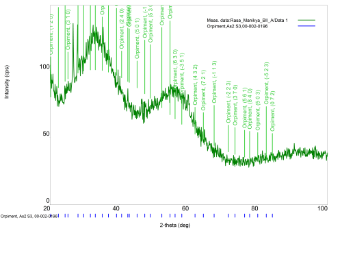 The three rasamanikya (3 batches) samples have near identical XRD patterns with two small but prominent peaks at 26.7 and 27.9 degrees respectively; only one sample shows a peak at 67.8 degrees to the samples were compared with earlier reported XRD patterns [19]. This shows the XRD of the ‘haratala’ (arsenic trisulphide/Orpiment) used to make these samples by heating haratala at high temperatures while holding the samples between mica sheets. The XRD of rasamanikya samples show a complete transformation into an amorphous state, barring two samples showing a peak due to a crystal phase (some fraction of hartala might have remained).