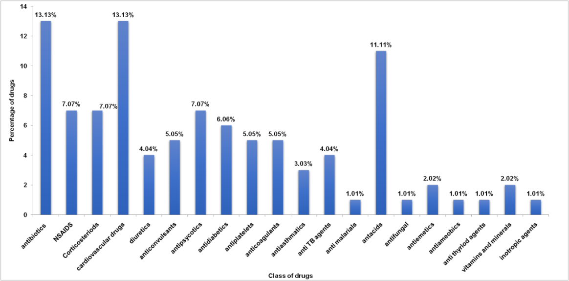 In this study antibiotics (13.13%) and cardiovascular drugs (13.13%) are associated with high number of drug interactions followed by antacids(11.11%), NSAIDS (7.07%), Corticosteroids (7.07%), antipsychotics (7.07%), antidiabetics (6.06%), anticonvulsants (5.05%), antiplatelet (5.05%), anticoagulants (5.05%), diuretics (4.04%), anti TB agent s (4.04%), antiasthma agents (3.03%), antiemetic’s(2.02%), vitamins and minerals (2.02%), anti-malarial(1.01%), antifungal agents (1.01%), anti-amoebic (1.01%), anti-thyroids agents(1.01%) and inotropic agents(1.01%) were shown in fig. 1.
