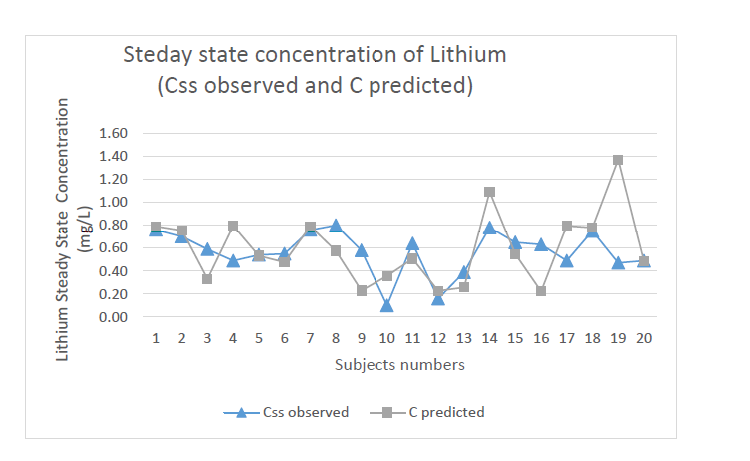 Objective: The purpose of the study was to estimate the pharmacokinetic parameters and calculate the precision (%RMSE) of the predicted lithium concentration equation.