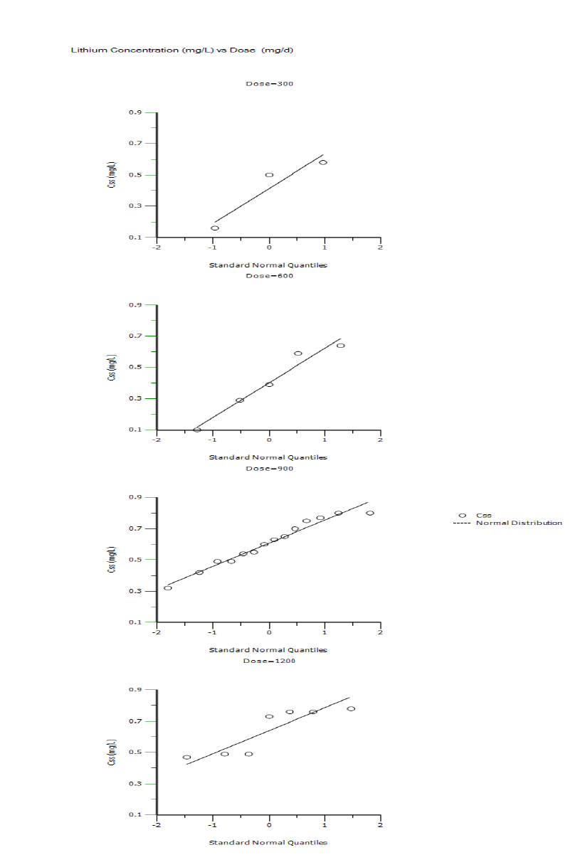 The distribution of serum lithium concentration by lithium dose was presented in fig. 2 and 3, respectively.
