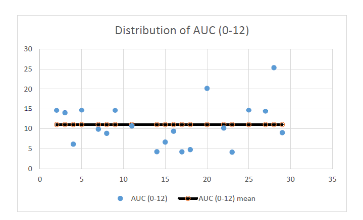 Fig. 8: The distribution of area under the concentration-time curve at 0-12 h (AUC) of lithium (mg h/l)