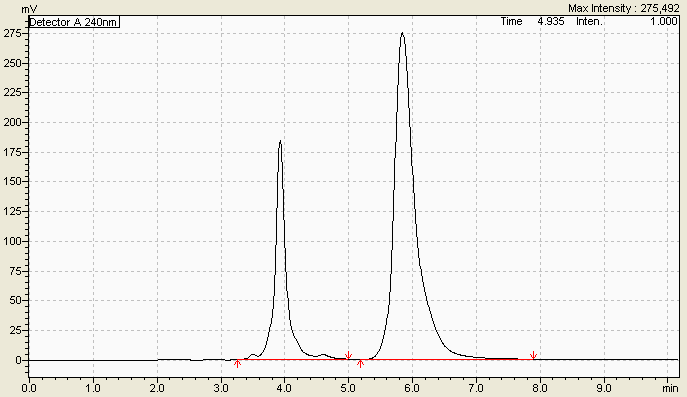 In order to test the applicability of the developed method to a commercial formulation, ‘MEVA C’ capsules were chromatographed at working concentration and it is shown in fig. 8. The sample peaks were identified by comparing the relative retention times with the standard drugs (fig. 6-7). System suitability parameters were within the acceptance limits, ideal for the chromatographed sample. Integration of separated peak area was done and each drug concentration was determined by using the peak area concentration relationship obtained in the standardization step. The protocol affords reproducible quantification of the two drugs with an error less than 10%, which is the standard level in any pharmaceutical quality control.