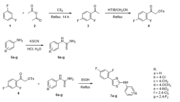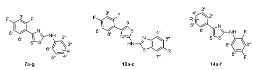 Synthesis of 2-aryl/benzothiazolylamino-4-(2,4-difluorophenyl) thiazoles (7a-g, 10a-c) and 2-(2,4-difluorophenyl)amino-4-arylthiazoles (14a-f)