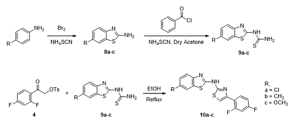 The various anilines on treating with bromine/ammoniumthiocyanate gave the corresponding benzothiazoles 8a-c [22] which on treatment again with ammoniumthiocyanate/benzoyl chloride yielded benzothiazolyl urease 9a-c [23].